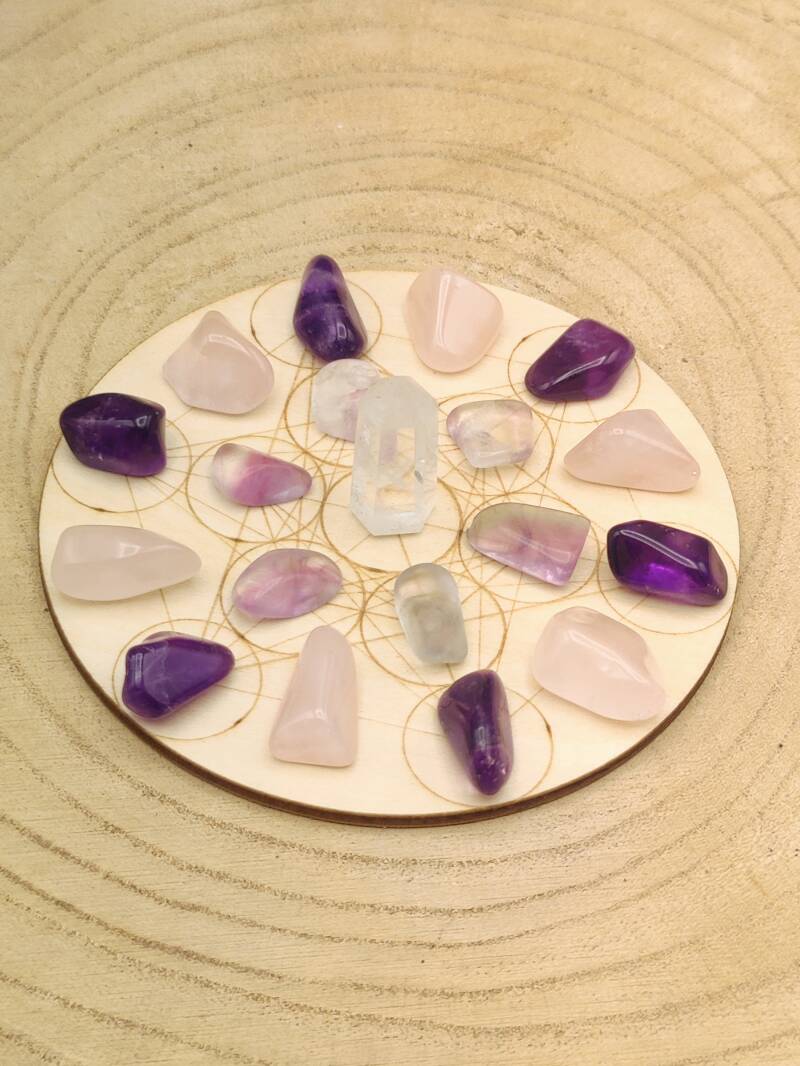 Om een edelstenengrid te maken leg je een aantal mooie stenen in een geometrische vorm op een raster.