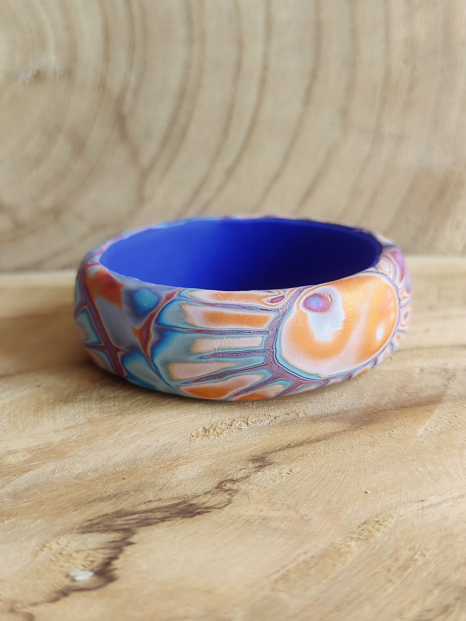 2 verschillende bangles van massieve polymeerklei in blauw met oranje en ronde afwerking