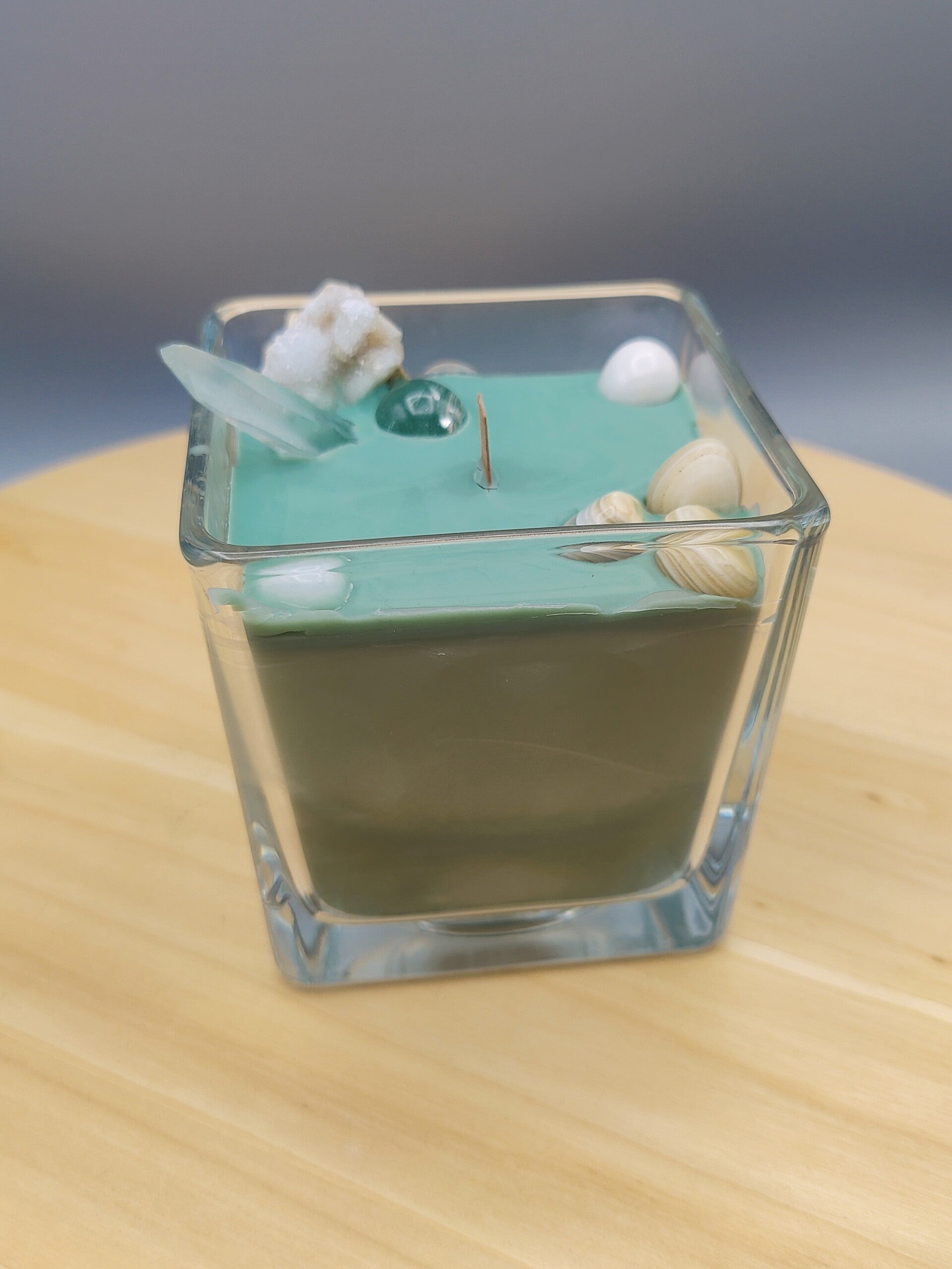 Kaars in vierkant glas bergkristal, agaat, betoverend bos glitter
